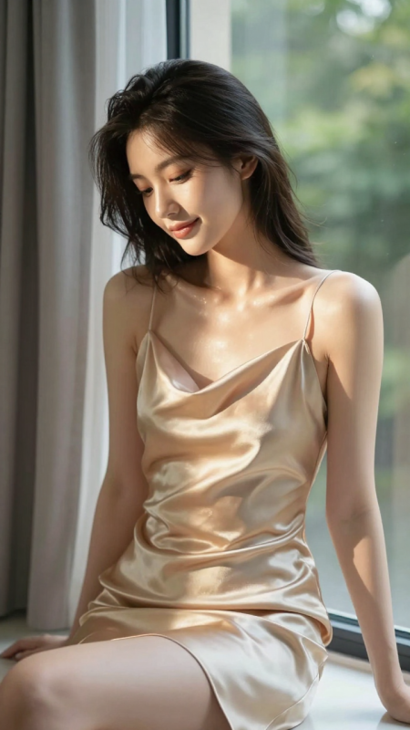 一位溫柔知性的亞洲女生,穿著香檳金緞面吊帶短裙,坐在清晨陽光灑入的窗邊。光線從右側斜射,在她肩頸與裙擺投下溫暖光斑,背景是淺灰窗簾與模糊綠植。她微微低頭,嘴角含笑,神情恬靜。寫實風格,8K高清,柔焦+輕微底片感,強調緞面反光與肌膚通透度。