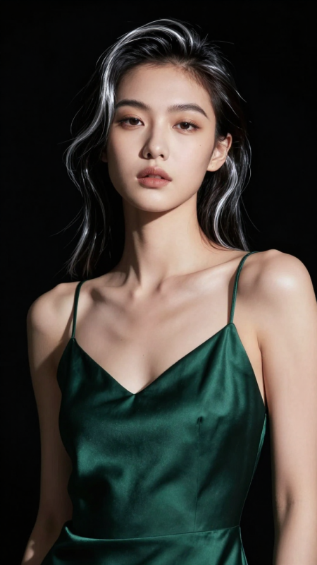 一位氣質冷豔的亞洲女模特,身穿墨綠色緞面吊帶裙,站在全黑背景前。單燈從45°角打亮臉部與鎖骨,形成強烈明暗對比,髮絲邊緣泛著銀白輪廓光。她眼神銳利直視鏡頭,嘴唇微抿,充滿高級時裝大片感。寫實+電影佈光,8K超清,強調材質光澤與立體結構。