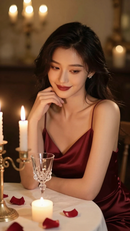 一位浪漫迷人的亞洲女子,穿著酒紅色緞面吊帶裙,坐在燭光搖曳的餐桌旁。暖黃燭光從下方照亮她半張臉,背景虛化成朦朧光斑,桌上擺放水晶杯與玫瑰花瓣。她輕托下巴,眼神溫柔帶笑,氛圍私密而奢華。寫實人像,8K畫質,柔光+輕微光暈特效,突顯緞面流動感。