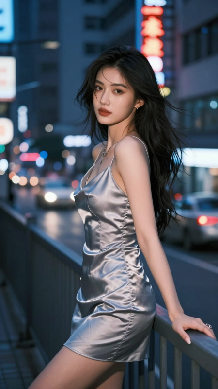 一位摩登性感的亞洲美女,身穿銀灰色緞面吊帶短裙,倚靠在城市天台欄桿邊。背後是模糊的霓虹招牌與車流光軌,冷藍色環境光與暖膚色形成撞色。她回眸一笑,髮絲被風吹起,眼神帶點神祕。寫實+賽博龐克光影,8K高清,強調布料反光與動態氛圍。