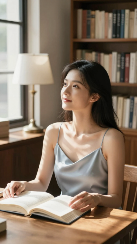 一位知性優雅的亞洲女孩,穿著淺灰藍緞面吊帶裙,坐在木質書桌前翻閱書籍。陽光從左側窗戶斜入,在她側臉與書頁上形成條紋光影,背景是滿牆書架與落地燈。她抬頭微笑,眼神清澈。寫實生活感,8K畫質,柔光+輕微景深,強調安靜氛圍與材質細節。