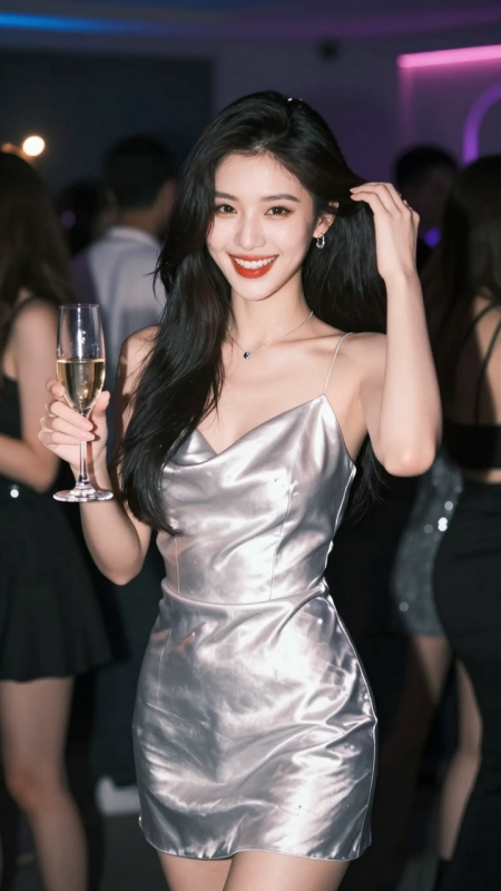 一位閃耀奪目的亞洲女郎,身穿亮銀色緞面吊帶短裙,在私人派對中被閃光燈定格。背景是模糊人群與彩色燈光,她一手舉香檳杯,一手撩發,笑容燦爛自信。寫實+動態抓拍感,8K高清,強調高光反射與瞬間情緒爆發力。