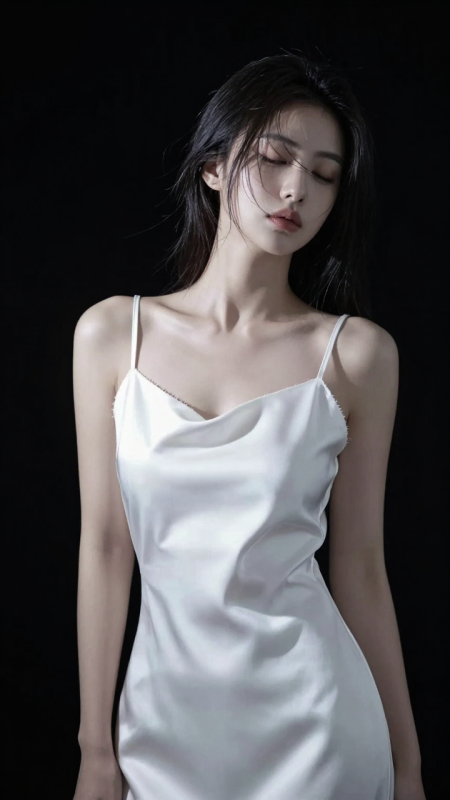 一位極具藝術感的亞洲女性,身穿純白緞面吊帶裙,置身於純黑背景中。僅用一盞硬光從側面打亮她半邊身體,形成強烈的黑白對比,髮絲與裙子邊緣清晰銳利。她閉目沉思,表情寧靜空靈。寫實+高對比度,8K超清,突出輪廓線條與面料質感,宛如現代藝術肖像。