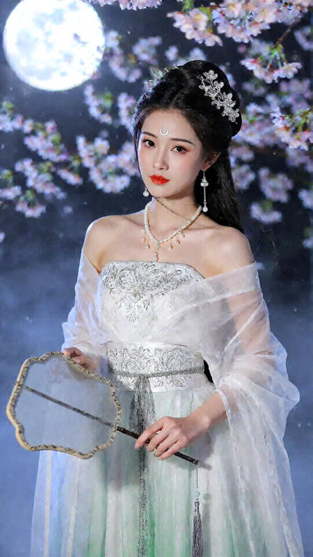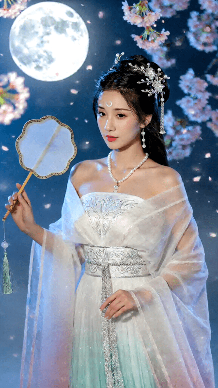 身穿素白漸層薄紗長裙,肩部微露,袖口寬大飄逸,腰繫銀絲繡花束腰,綴有流蘇。她手持團扇,目光含情,背景是皎潔月光與飄落的櫻花,電影柔光鏡頭,高清8K,肌膚如瓷,氛圍靜謐清冷。