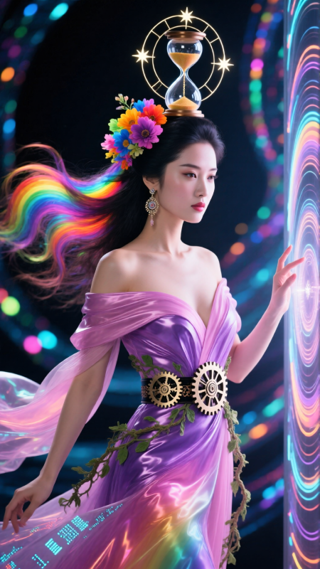 穿越時空的東方美人,烏髮染上彩虹光暈,發間懸浮時間沙漏與彩色花朵,額飾為螺旋星圖。身穿紫粉漸層流體長裙,露肩設計,腰帶為齒輪與藤蔓結合,裙擺如數據流飄動。她指尖輕觸時光之門,眼神神秘,背景是扭曲時空與彩色光斑,電影科幻幻想風,高清8K,動態模糊+銳利焦點,未來感十足。