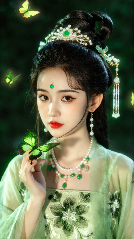 一位絕美東方古風少女,烏黑長髮高盤成髻,佩戴翡翠珍珠髮冠與垂墜流蘇耳飾,額間點綴綠色寶石。她身穿淡綠色薄紗漢服,衣料輕盈透亮,繡有暗紋花卉,頸戴多層翡翠珍珠項鍊,妝容精緻,紅唇溫婉。她指尖輕託一隻螢光綠蝴蝶,眼神溫柔寧靜。背景是深綠色朦朧光影與漂浮的發光蝴蝶,整體氛圍空靈唯美、高貴典雅,高清8K畫質,電影寫真風格,細膩光影渲染。