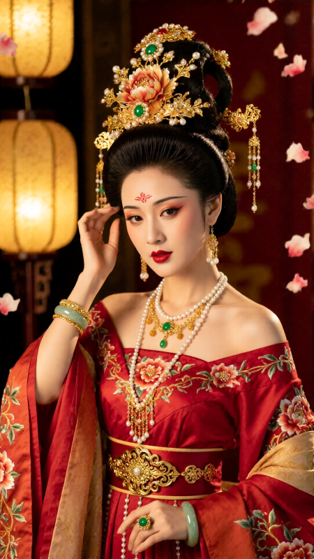 身穿緋紅漸層刺繡長袍,露肩設計,胸前垂落金線珠鍊,腰帶為雕花金扣,手戴玉手鐲與戒指。她輕撫發鬢,朱唇微啟,背景是宮廷燈籠與飄落花瓣,電影戲劇佈光,高清8K,奢華富貴,氣場強大。
