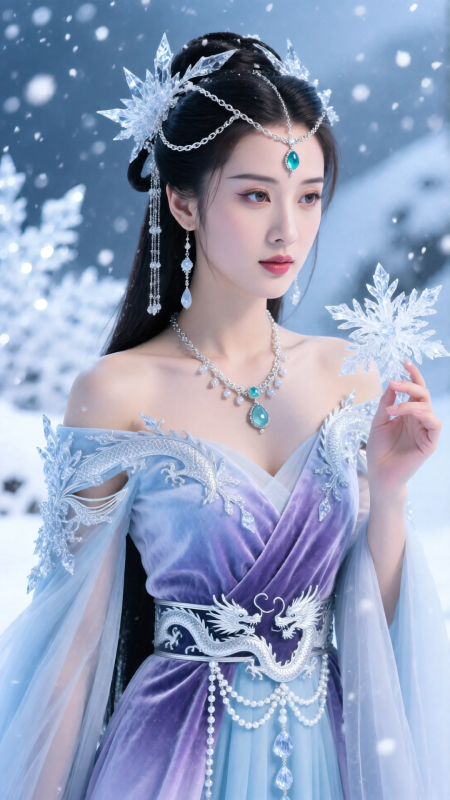 雪域降臨的東方神女,烏髮半披,發間纏繞冰晶與銀鍊,眉心鑲嵌寒玉寶石。身穿淡藍紫漸層絲絨長裙,肩部鏤空,綴滿冰晶刺繡,腰帶為銀龍盤繞造型,垂掛水晶珠串。她指尖輕觸一朵冰花,眼神清澈如水,背景是飄雪與冰晶光斑,電影冷調柔光,高清8K,氣質清冷高貴。