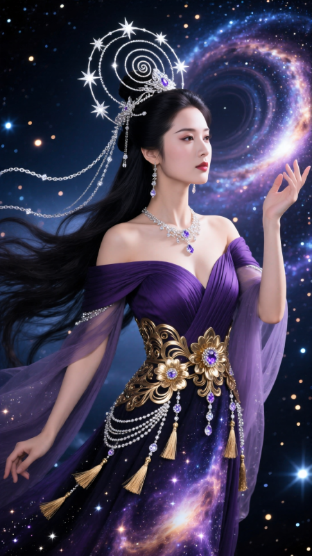 身穿深紫漸層露肩禮服,胸線立體,腰間金屬花紋繁復,裙擺拖地如星雲,綴滿閃鑽與流蘇。她抬手輕撫星空,眼神溫柔堅定,背景是旋轉星雲與漂浮光點,電影史詩感構圖,高清8K,CG渲染質感,氣勢恢宏優雅。