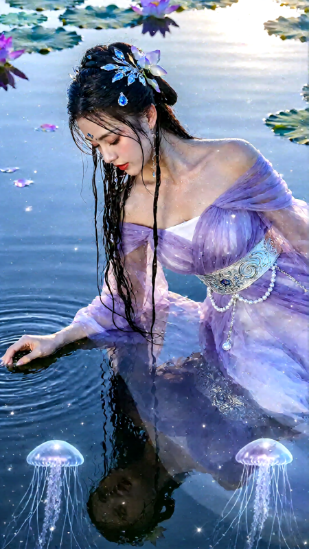 身穿淡紫紗裙,露肩設計,腰帶為水紋銀環,裙擺如漣漪擴散,綴有珍珠與水母般光點。她輕觸水面,倒影清晰,背景是倒映星空的湖面與漂浮花瓣,電影逆光拍攝,高清8K,光影通透,夢幻如鏡。