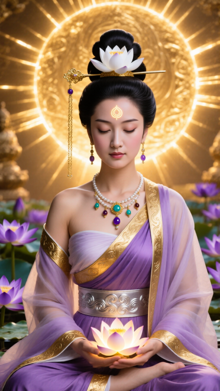 蓮台上的東方聖女,烏發盤起,插著白蓮與金鍊髮簪,眉心有佛光印記。身穿淡紫金邊露肩長袍,衣料輕盈如雲,腰繫祥雲紋銀帶,頸戴七寶瓔珞,手捧發光蓮花。她閉目冥想,神情莊嚴,背景是金色佛光與紫色蓮花池,電影宗教美學構圖,高清8K,神聖莊嚴,光影柔和,細節極致。