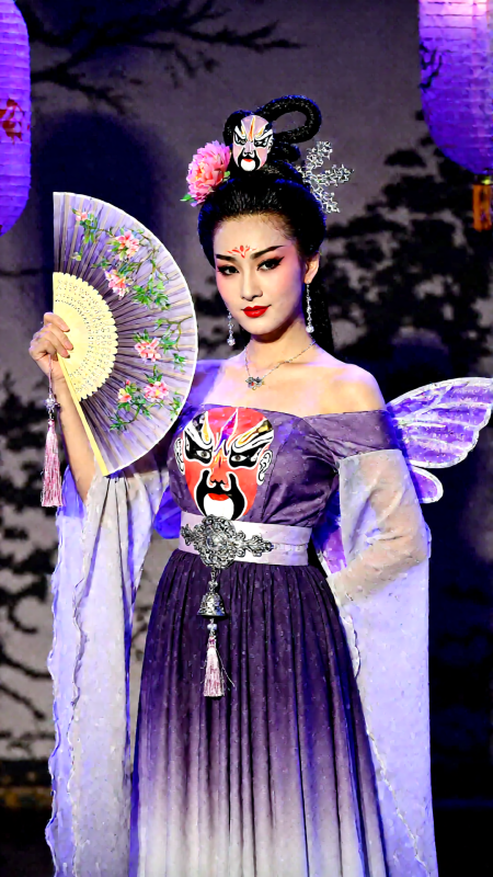 梨園幻境中的東方仙伶,烏髮梳成古典髮髻,插著牡丹與銀簪,額飾為戲曲臉譜紋樣。身穿淡紫漸層戲服式長裙,露肩設計,袖口寬大如蝶翼,腰帶為雕花銀扣,綴有鈴鐺與流蘇。她手持折扇,眼神含情,背景是水墨舞台與紫色燈籠,電影戲劇佈光,高清8K,妝容精緻,紅唇點睛,傳統與幻想交融。