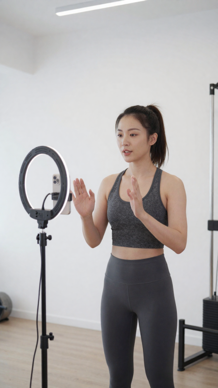 一位精緻專業的亞洲健身部落客,穿著炭灰運動背心+高腰緊身褲,站在專業直播間內,手機支架架在三腳架上,背後是環形補光燈,她正講解動作要領,表情生動。背景是極簡白牆與健身器材,畫面乾淨明亮。寫實+輕微濾鏡,8K高清,強調內容專業與視覺品質。