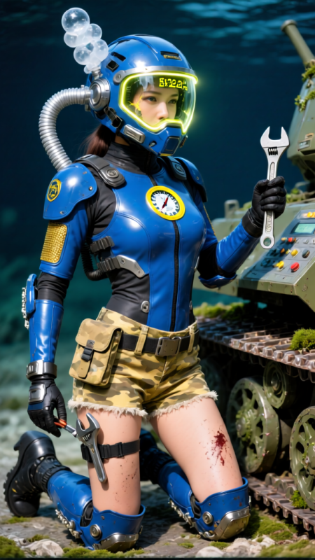 東方美女穿著鈷藍流線型抗壓套裝,懸浮於深海機甲胸腔。頭盔環形燈照亮胸前氣壓表(顯示352atm),肩部排氣閥持續冒出銀白氣泡。抗壓衣關節處加裝鈦合金補強圈,腳蹼狀靴底吸附機甲內壁的苔蘚,右手檢測儀伸出探針插入控制台接口。
