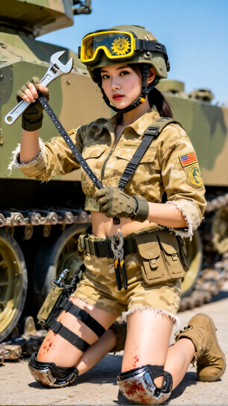 東方美女穿着沙黄迷彩短装,跪在机甲履带旁。头盔目镜切换成透视模式,显示内部齿轮的黄色故障框;右手扳手卡在变形的螺栓上,左手拽着断裂的传动带。防护服肘部磨出毛边,露出内衬的金属纤维层,腰包工具钳沾着油污,在烈日下反出炫光。