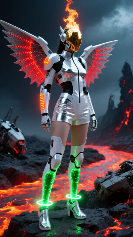 東方美女穿著銀白反射短套裝,站在岩漿河邊機甲殘骸上。背部散熱鰭片全部展開,縫隙間噴出赤紅熱浪;小腿液冷管裡流動著螢綠冷卻劑,在腳踝處形成環狀光帶。面罩鍍金層映出沖天火柱,左臂溫度警報器閃著刺目的橙光。