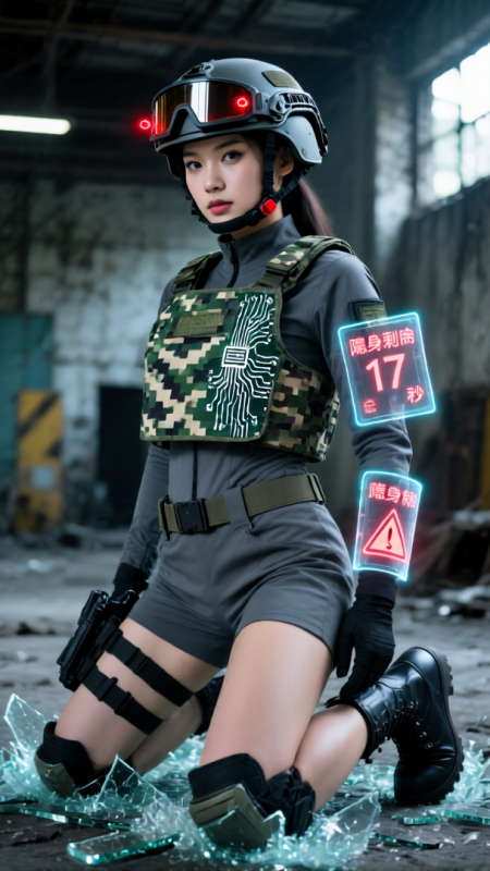 東方美女穿著石墨灰隱形作戰短套裝,半跪在廢棄工廠。迷彩產生器在左肩形成像素化斷層,露出內襯的電路板紋路;頭盔目鏡顯示週邊熱源標記(3個紅點向2點鐘移動)。右手腕全像螢幕彈出「隱身剩餘17秒」的警告,靴跟壓碎的玻璃渣在隱身場邊緣閃爍微光。
