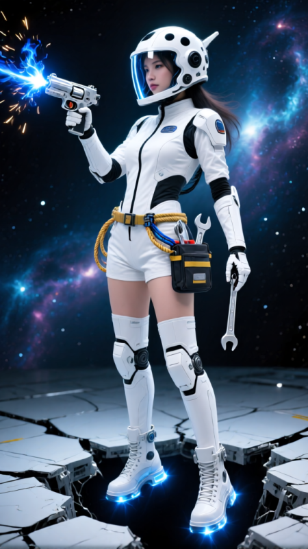 東方美女穿著珍珠白太空維修短套裝,漂浮在機甲裂縫處。磁力靴吸在裝甲板,腰部安全繩纏住暴露的電纜。頭盔側面焊槍噴出藍焰,火星濺在面罩防爆層形成黑點;工具包裡的扳手懸浮在腿側,反射遠處星雲的冷光。