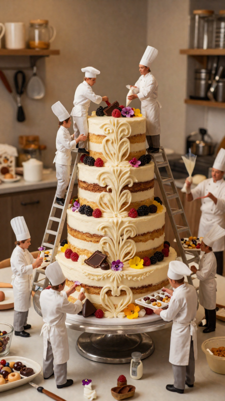 穿著經典白色制服和廚師帽的迷你糕點師傅們,正在小心翼翼地裝飾一個巨大的多層蛋糕。有些人使用迷你裱花袋製作複雜的糖霜設計,而另一些人則放置新鮮的漿果、可食用的花朵和巧克力裝飾。有幾個人在梯子和腳手架上保持平衡,以便到達頂部,而另一些人則拿著裝滿精緻糖果裝飾品的托盤。蛋糕的質地非常漂亮,有著光滑的糖霜、豐富的層次和奢華的表面。場景是一個溫暖、光線柔和的糕點廚房,散落著烘焙工具和食材,增添了舒適而迷人的氛圍。以超寫實的照片捕捉,帶有異想天開和優雅的風格。