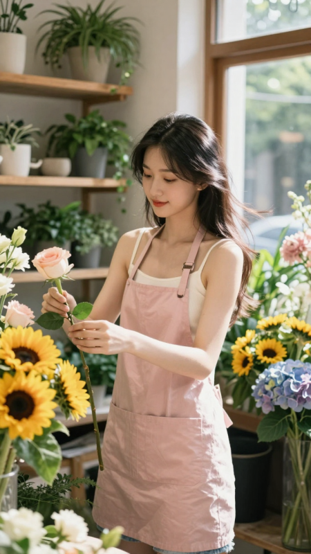一位溫柔恬靜的亞洲女孩,穿著米白吊帶+淡粉圍裙+牛仔短褲,在陽光灑落的花店內整理花束。她低頭專注地修剪玫瑰枝,周圍擺滿向日葵、繡球與綠植,背景是原木貨架與玻璃櫥窗。她嘴角微揚,髮絲被風吹起,氛圍浪漫療癒。寫實風格,8K高清,柔焦+自然光效,強調花朵色彩與布料質感。