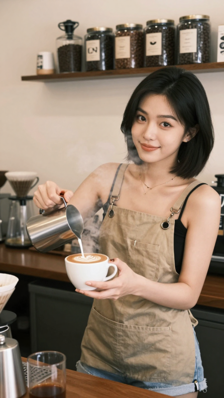 一位元氣滿滿的亞洲女咖啡師,身穿黑色吊帶+卡其色圍裙+捲邊牛仔短褲,在復古咖啡館吧台後製作拿鐵拉花。蒸氣噴嘴輕吐白霧,她專注於凝視杯中奶泡,指尖沾著咖啡漬,背景是咖啡豆罐與手衝架。她抬頭微笑,眼神自信專業。寫實+輕微暖調濾鏡,8K超清,突顯動作細節與職業魅力。