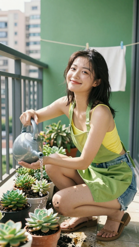 一位活力四射的亞洲女孩,穿著檸檬黃吊帶+草綠圍裙+高腰牛仔短褲,在城市公寓陽台打理盆栽。她蹲在地上給多肉澆水,泥土沾在膝蓋,背景是綠色牆與晾衣繩,陽光透過百葉窗灑下條紋光影。她抬頭微笑,汗珠晶瑩,充滿健康生命力。寫實+自然光,8K高清,強調植物生機與人物動感。