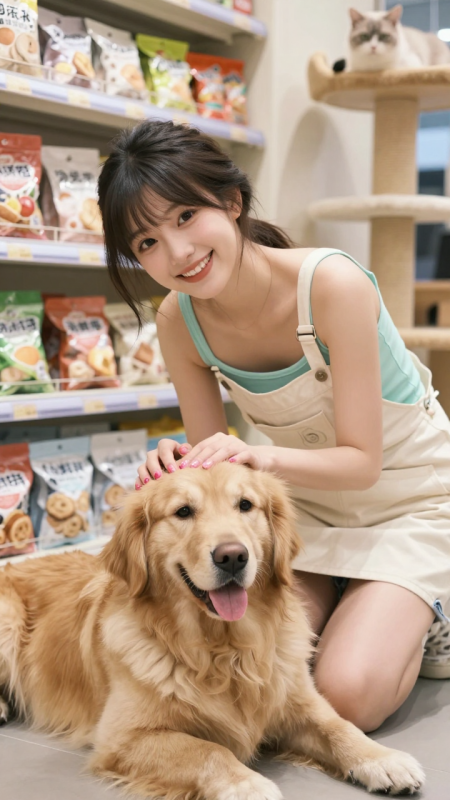 甜美親和的亞洲少女,穿著薄荷綠吊帶+米白圍裙+牛仔短褲,在寵物店為金毛犬梳理毛髮。狗狗乖巧趴著,她彎腰輕撫狗頭,指甲塗著粉紅色美甲,背景是寵物零食架與貓咪爬架。她笑容燦爛,眼神溫柔,充滿愛與活力。寫實+柔光,8K高清,強調人寵互動與可愛氛圍。