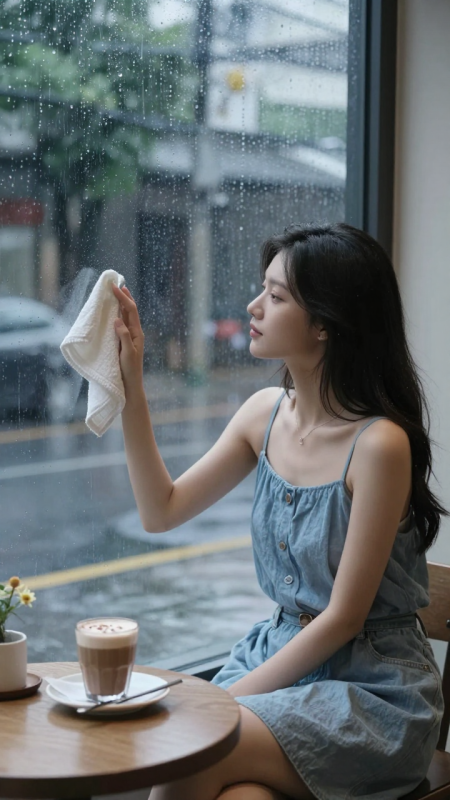 一位文藝氣質的亞洲女生,穿著霧霾藍色吊帶+亞麻圍裙+牛仔短褲,坐在雨天咖啡館窗邊擦拭玻璃。窗外雨滴滑落,她側身望向街景,手中抹布輕擦,桌上放著熱可可與筆記本。她神情寧靜,略帶憂鬱,氛圍安靜詩意。寫實+冷調光影,8K超清,突顯雨天朦朧感與人物情緒。