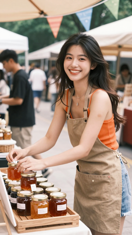 一位陽光開朗的亞洲女孩,穿著橘色吊帶+帆布圍裙+牛仔短褲,在週末市集攤位前擺放手工果醬。她正貼標籤,笑容燦爛,背景是木製攤位、野餐籃與彩旗,路人模糊經過。她手臂微曬,髮梢飛揚,充滿創業活力與自由感。寫實+自然光,8K高清,強調市集熱鬧氛圍與產品細節。