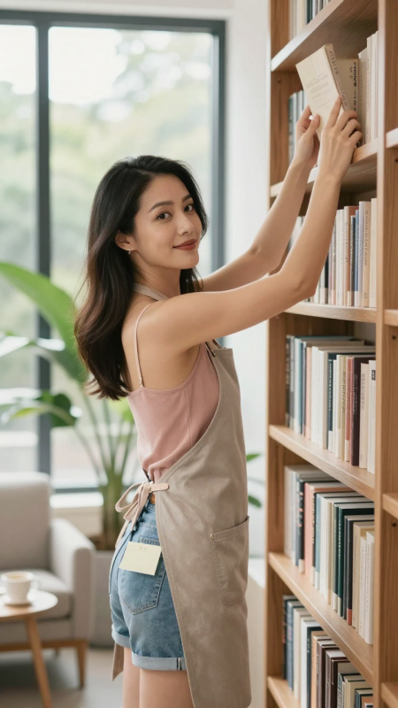 一位知性幹練的亞洲女性,穿著藕粉吊帶+淺咖圍裙+牛仔短褲,在陽光灑入的書房整理書架。她踮腳取書,圍裙口袋塞著便條紙,背景是落地窗、綠植與咖啡杯。她回頭微笑,眼神聰慧,氣氛安靜高效。寫實+柔光+輕微景深,8K超清,突顯知識感與生活美學。