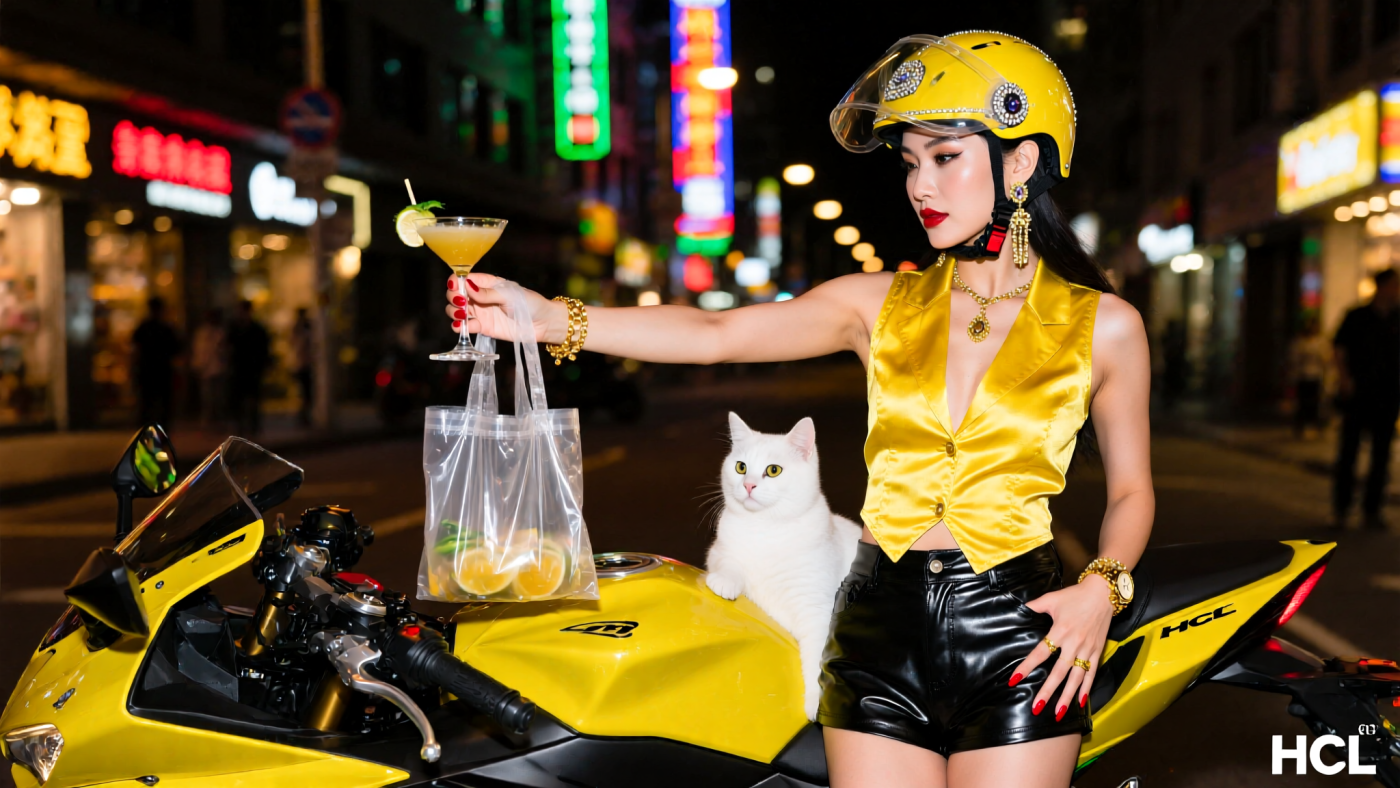 極品傑作照,電影運鏡。夜間都會街道,模糊霓虹燈光暈背景,溫暖側光,主體東亞裔性感女郎,22歲,身高175公分,S身材,1.5倍腿長,上圍豐滿,著亮黃色絲綢馬甲式上衣與黑色漆皮短褲,戴亮黃色鑲鑽安全帽,透明防風鏡向上推,臉略偏右,眼神專注,嘴角微揚。右手臂向前伸,優雅遞出高腳玻璃特調飲品配透明塑膠時尚提袋;左臂沿身側舒展,輕扶亮黃色摩托車油箱。腳略偏右站立,深紅色單色指甲油,佩戴金錶、黃金手鍊、長吊墜耳環。一隻真活白貓與主角依偎於摩托車旁。中景低角度,淺景深,特寫構圖,焦距85mm,光圈f/1.4。右下角有很小的”HCL”及貓咪浮水印。
